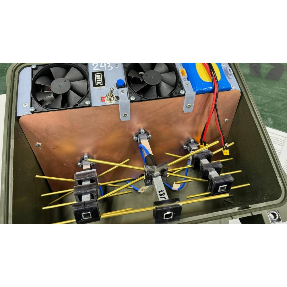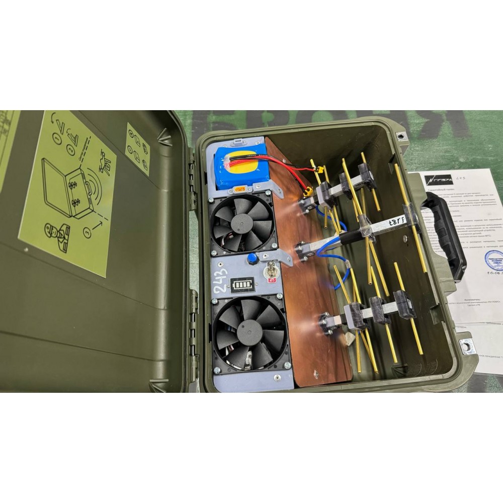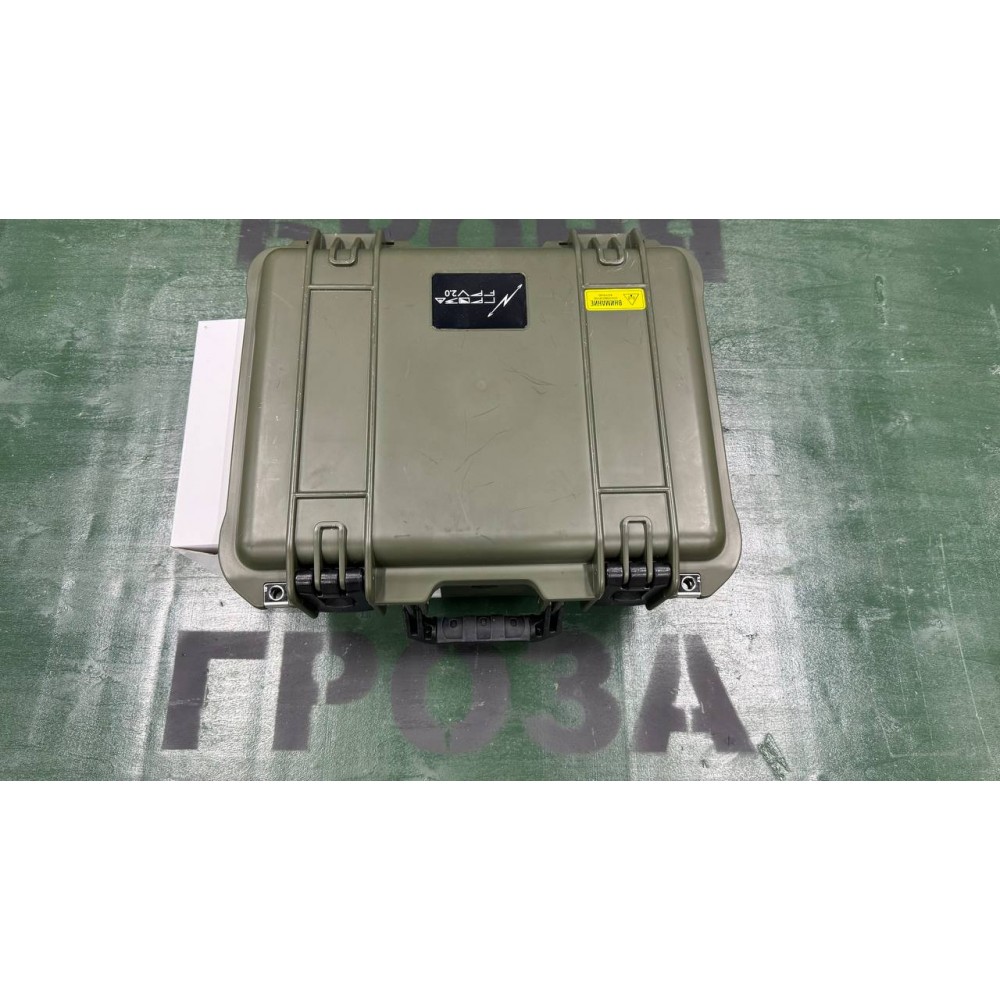 Подавитель БПЛА «Гроза ФПВ 2.1» - это устройство в защищенном и полностью герметичном кейсе. Оно предназначено для подавления как перепрошитых, так и стандартных FPV дронов. Управление осуществляется через тумблер включения подавления и кнопку активации индикатора заряда аккумулятора.