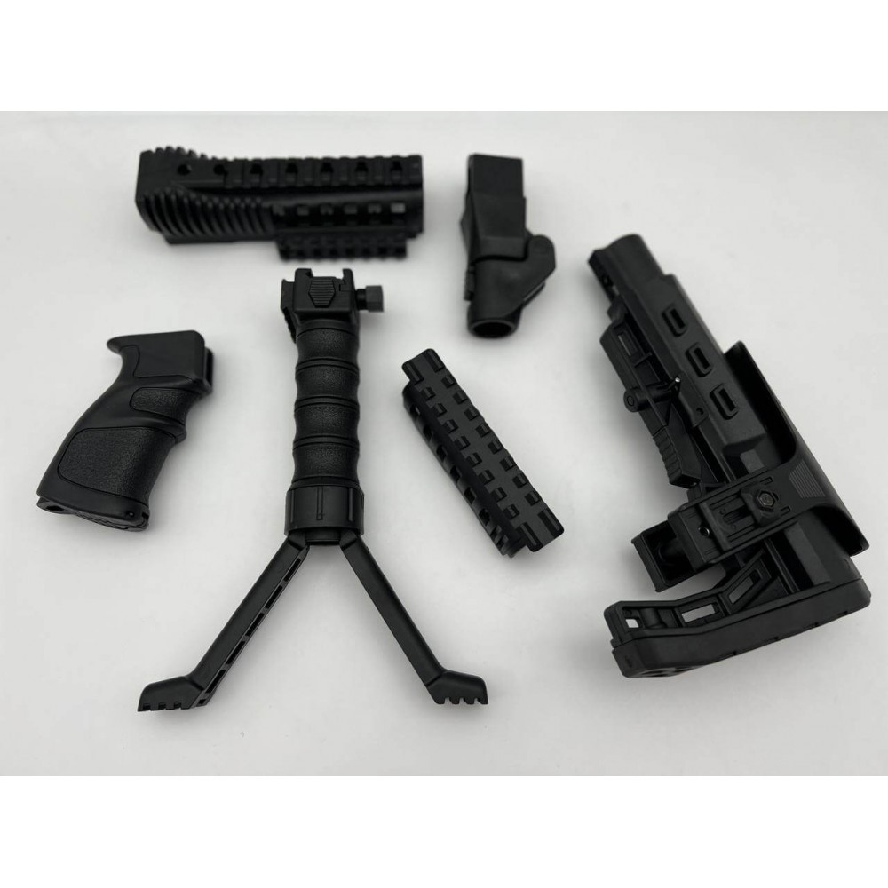 Боевой комплект обвеса представляет собой комплексные модификации и дополнения для винтовок АК 74, АК 47 и Сайга, разработанный и произведенный в Турции. Этот тактический инвентарь предназначен для повышения функциональности, комфорта и эффективности этих оружейных систем. Изготовленный из прочного противоударного пластика, специально для военных целей, он предоставляет разнообразные возможности для настройки и улучшения винтовок.